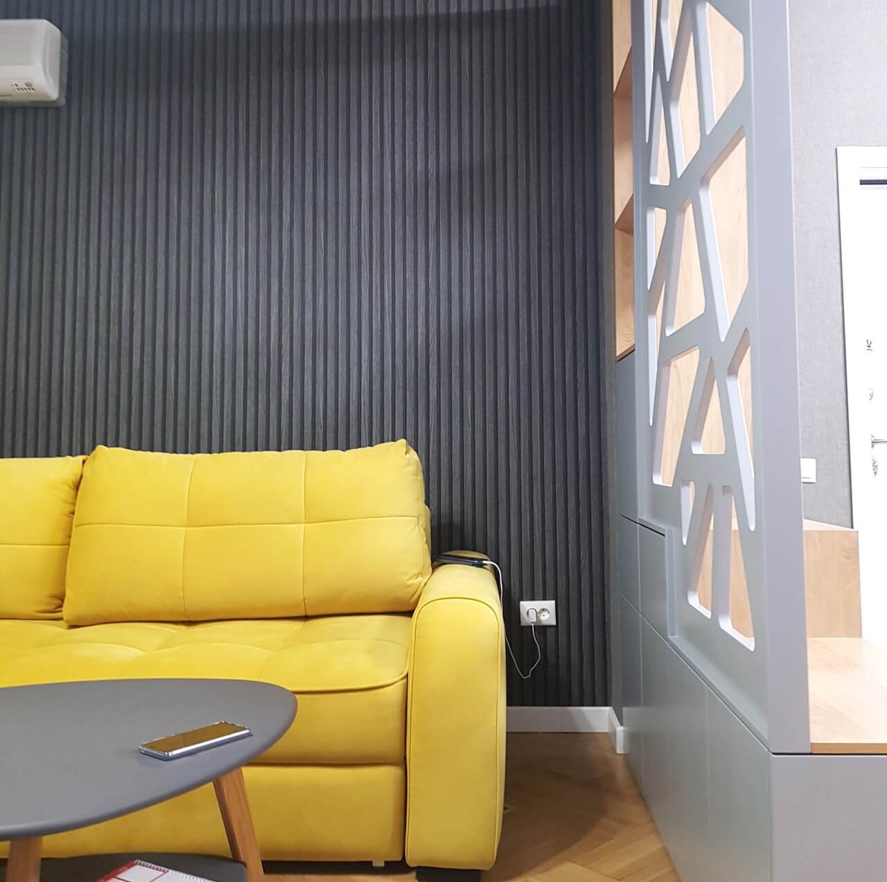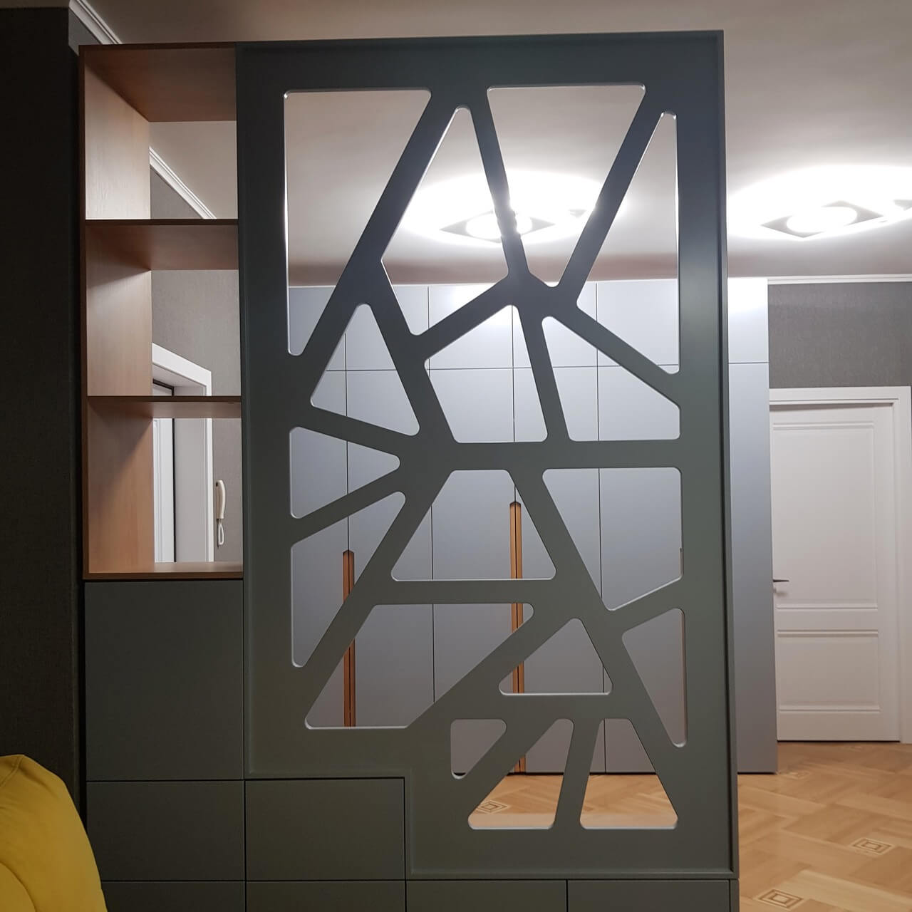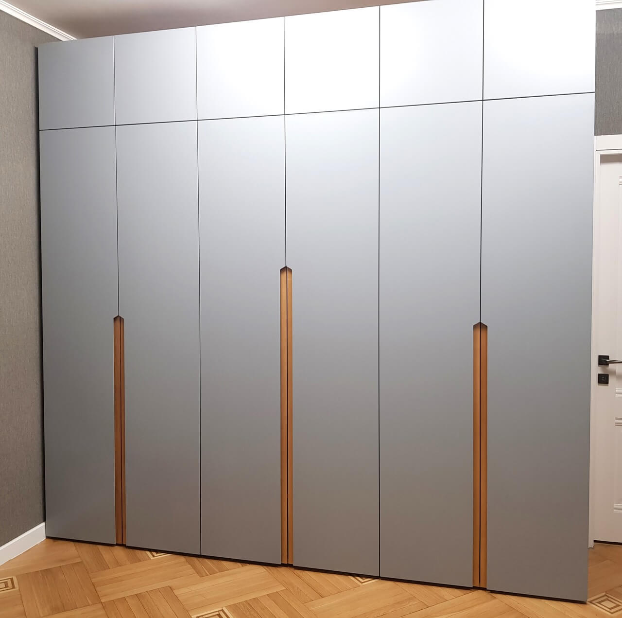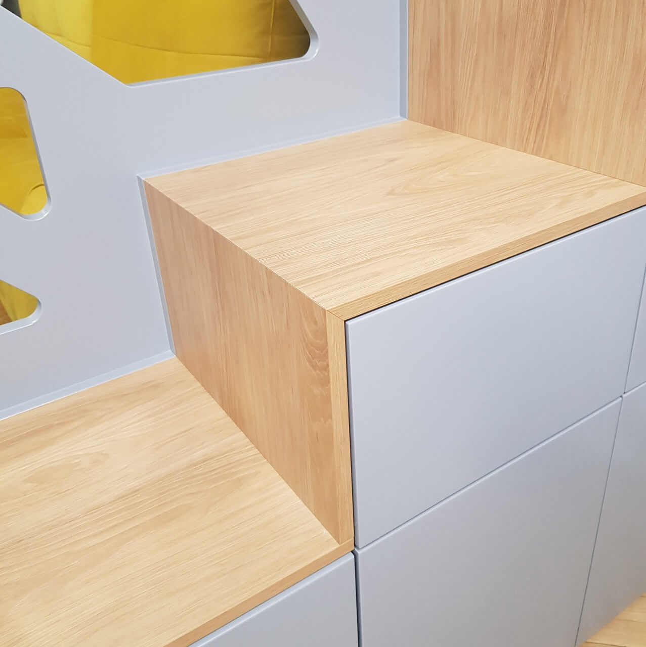 Фасады – крашеный МДФ Корпус - ЛДСП Egger. Интегрированная ручка - массив Ясеня Фурнитура - Blum. Столешница - пластик Egger. Перегородка - крашеный МДФ.