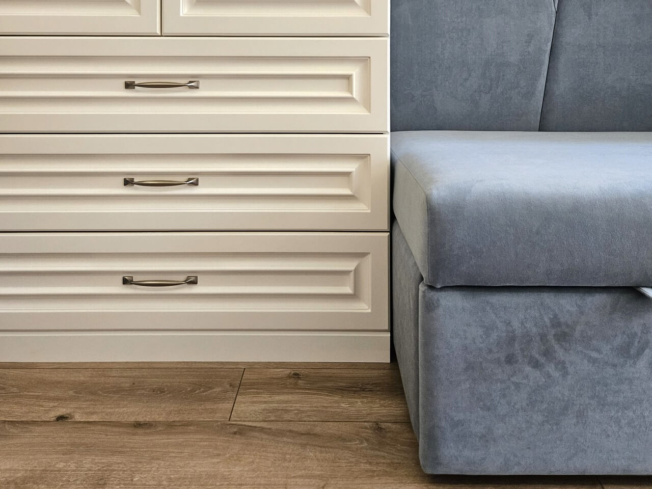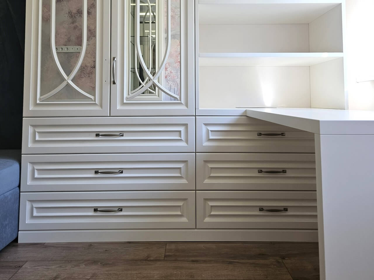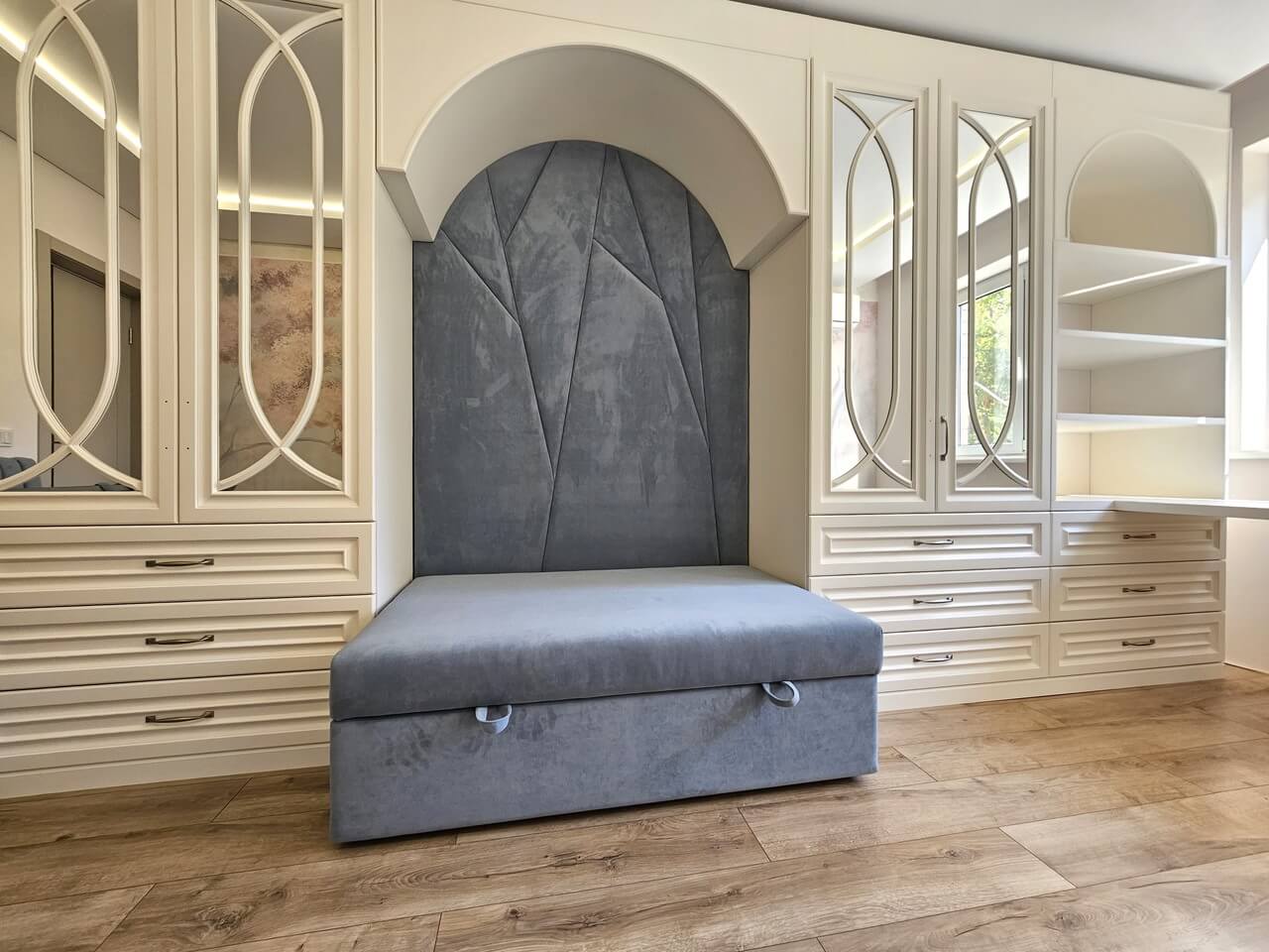 Фасады, видимые стороны, открытые полки – фрезерованный крашеный МДФ Арки - фрезерованный крашеный МДФ Витражи - стекло осветленное/зеркало. Корпус: ЛДСП Egger. Фурнитура - Blum. Столешницы - фрезерованный крашеный МДФ Диван, кровать с подъемным механизмом - антивандальная ткань.