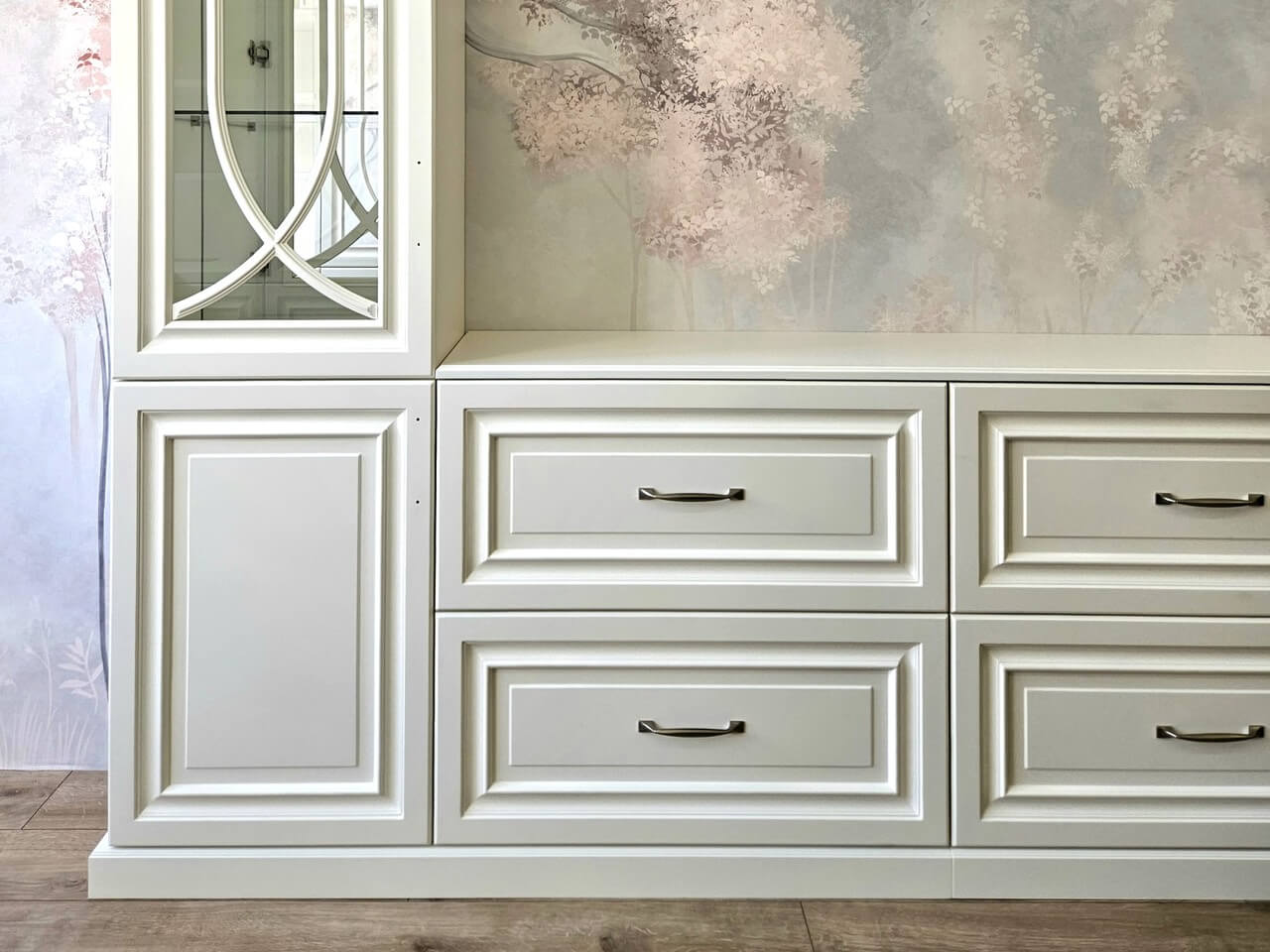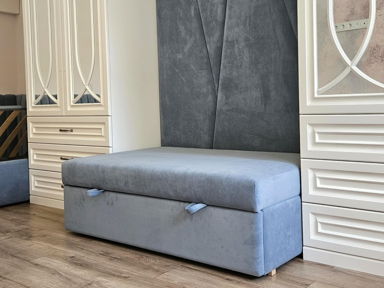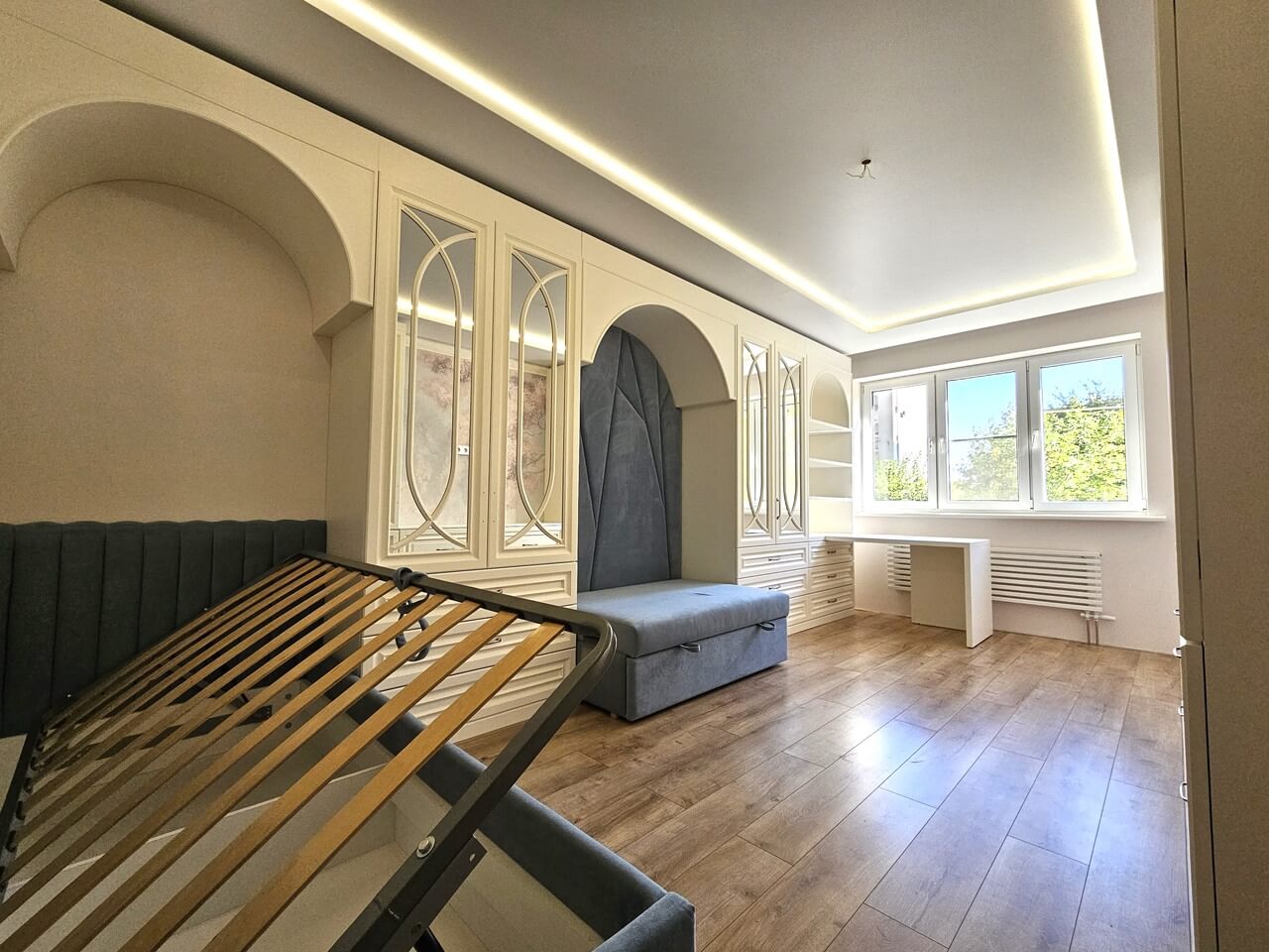 Фасады, видимые стороны, открытые полки – фрезерованный крашеный МДФ Арки - фрезерованный крашеный МДФ Витражи - стекло осветленное/зеркало. Корпус: ЛДСП Egger. Фурнитура - Blum. Столешницы - фрезерованный крашеный МДФ Диван, кровать с подъемным механизмом - антивандальная ткань.