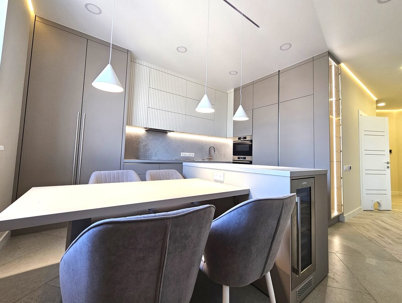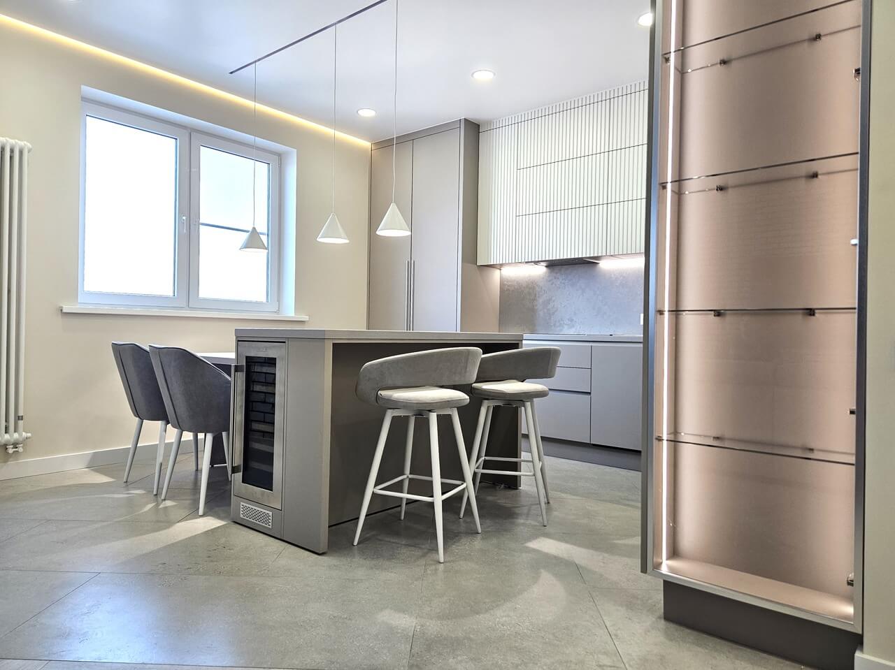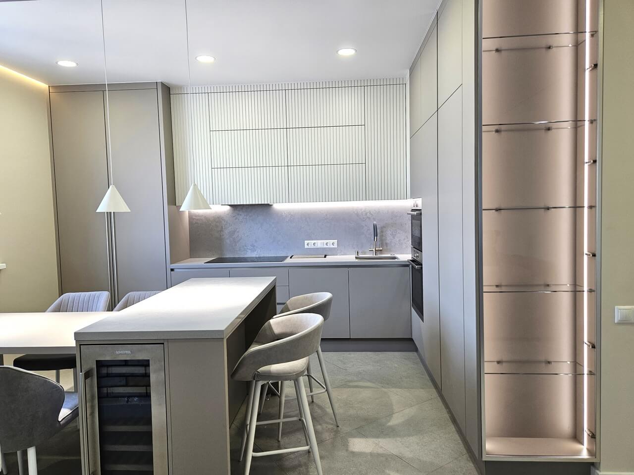 «Супер-матовая кухня с каменными столешницами, витриной и буфетом с поворотно-сдвижными дверями»
