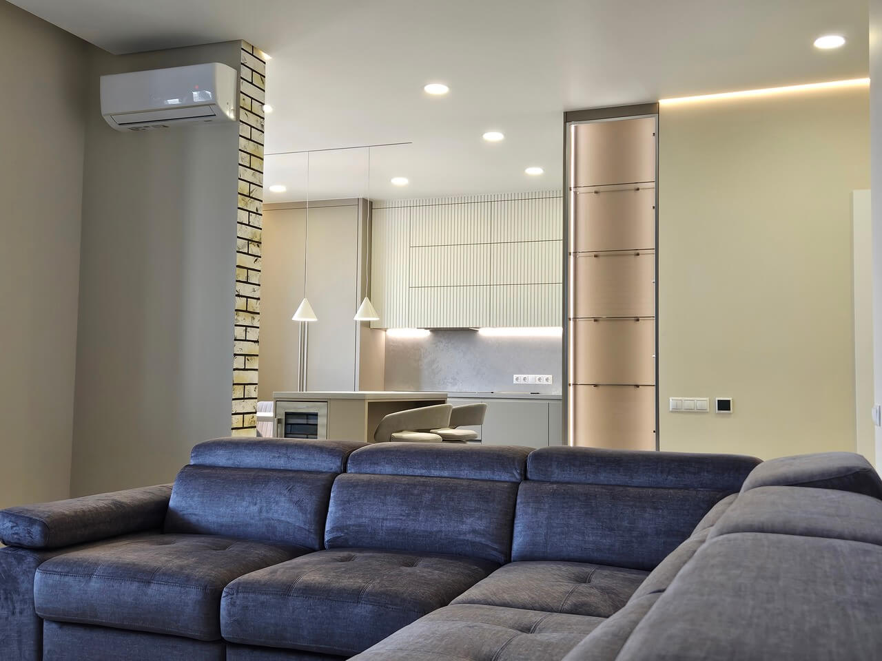 Фасады – супер-матовый пластик Fenix, фрезерованный крашеный МДФ. Столешницы: кварцевый агломерат и пластик Fenix. Фурнитура - Blum. Поворотно-сдвижная система: Salice (Exedra) Интегрированный профиль - Gola. Стекло тонированное Grey. Светодиодная подсветка столешницы, витрины и буфета.