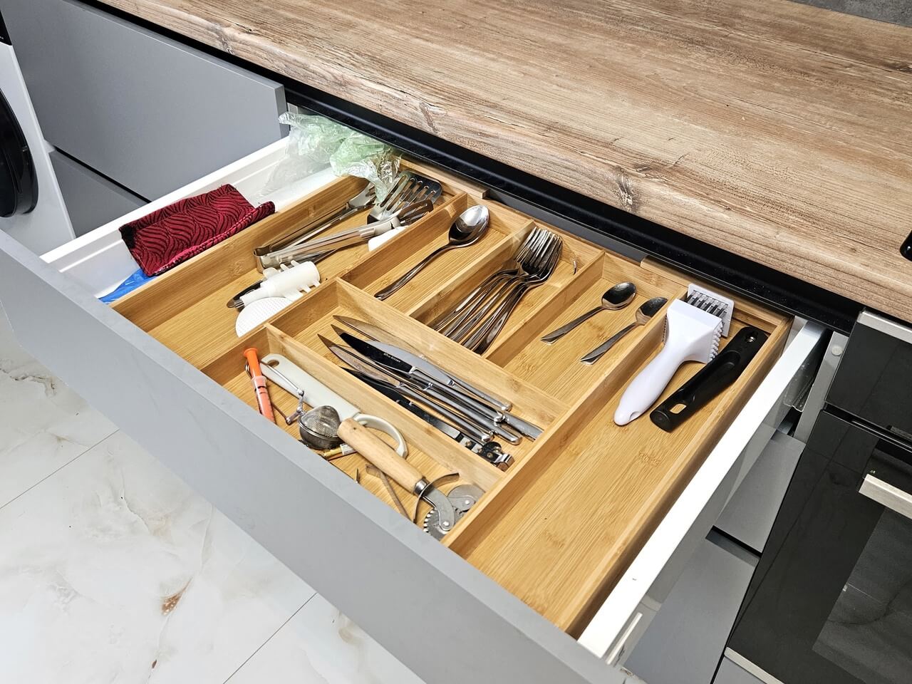 Фасады – МДФ+пластик Arpa. Корпус - ЛДСП Кроношпан Фурнитура - Hettich. Столешница - влагостойкий пластик Arpa. Интегрированный профиль - Gola.